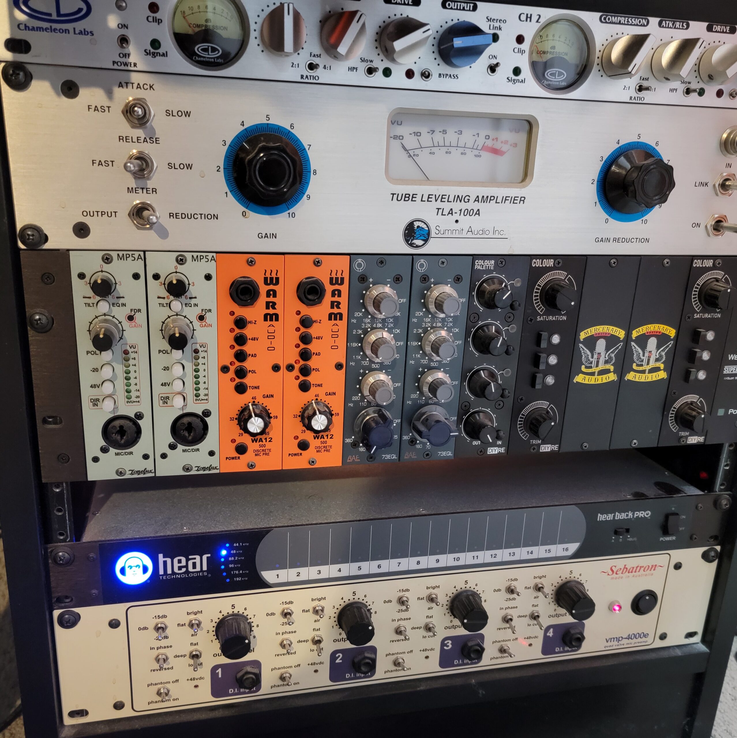 SSL X-rack for summing, bus compression, and 2-bus EQ. 1176’s. Distressors. BAE EQs, and more. All real. All analog.